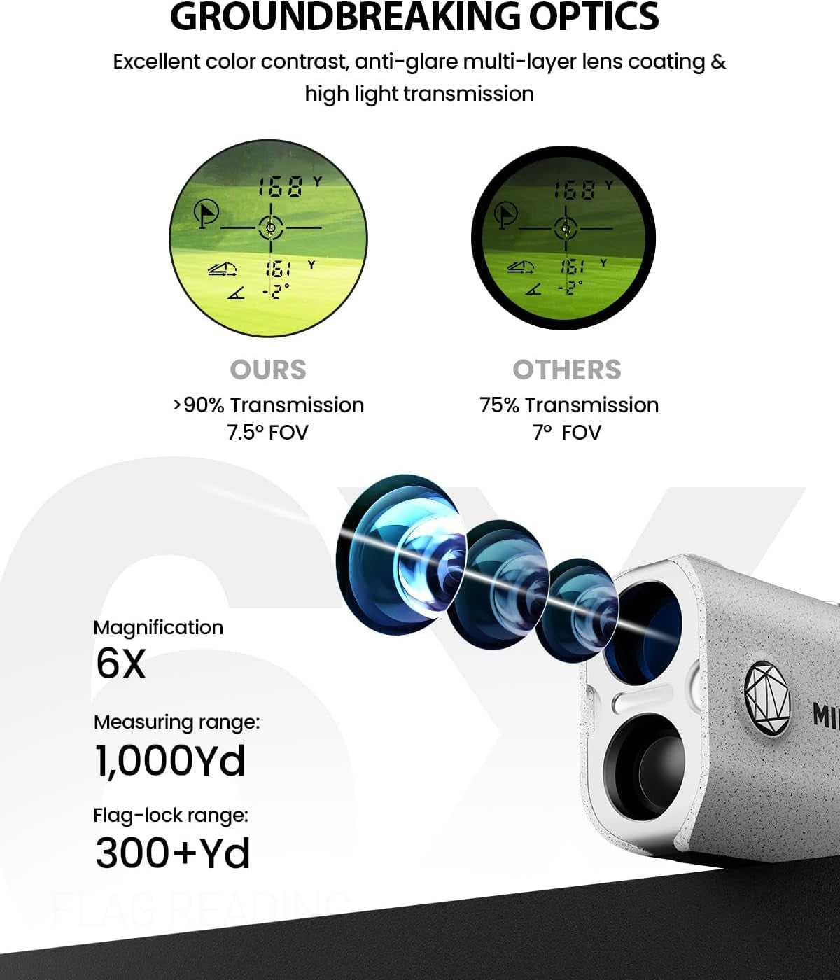 - Groundbreaking Optical Performance: with a lens system boasting a record-breaking high light transmission of over 90%, excellent color contrast, and anti-glare multi-coating, 6x magnification, PF1 makes measurements comfortably visible on its bright crystal-clear LCD display, and delivers remarkably sharp and crisp images even in adverse weather conditions. With a 7.5°wide field of view, PF1 provides a much wider and clearer perspective and changes the way you see the course.