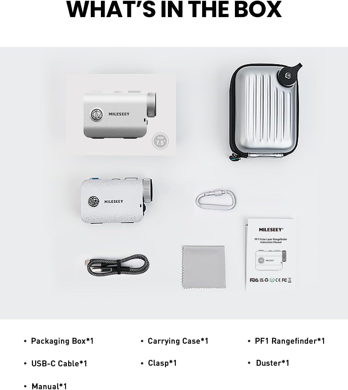 - Must-Have Golf Accessory: The PF1 is powered by an 800 mAh rechargeable lithium battery, provides a runtime of up to 5 hours and gives up to 15,000 measurements. The cutting-edge USB-C charging port supports multiple charging solutions - a power bank, car power, and outdoor power. What’s in the box: 1* PF1 rangefinder,1* manual.1* USB-C cable, 1* carrying box, 1*duster, 1*clasp. MILESEEY always provide 1-year unconditional warranty and lifetime technical support for its golf range finders.
